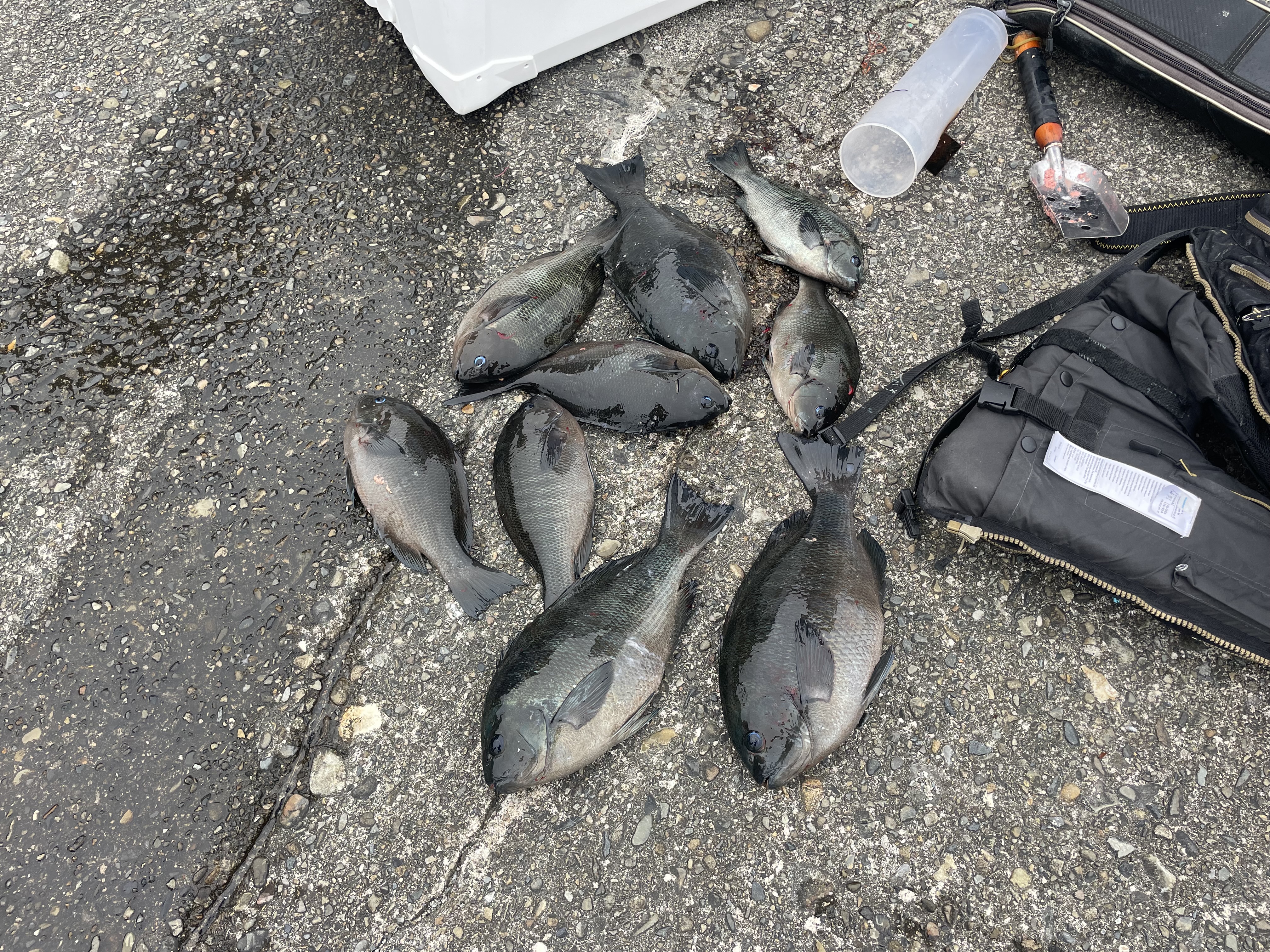 次のお客様の為に釣り終わったら自分の釣り場を落ちた撒き餌など綺麗に流してゴミを拾って帰ってきて下さい。ゴミや余った撒き餌は港で回収出来るので磯に捨てず持ち帰りよろしくお願いします。
